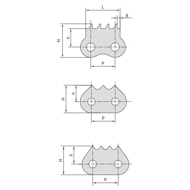 Ланцюг з кутовими зубцями, класифікований за типом направляючої, включає зовнішній зубчастий ланцюг, внутрішній зубчастий ланцюг і подвійний внутрішній зубчастий ланцюг. Ця ланцюгова передача використовує точне зачеплення ланцюга і зубців зірочки для передачі потужності і руху, забезпечуючи точне середнє передавальне число.