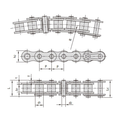 - Спеціальна конструкція для згинання:Розроблена для збереження цілісності та гнучкості ланцюга під час руху по кривих і вигинах, з радіусом R, меншим за відповідний радіус колії обладнання.